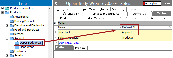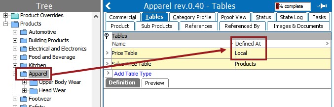 When an inherited table is changed at a lower level, a local override of the table is created. In this example, if changes are made to the table contents at the Apparel level, the table still has the same name, but the table definition is now different than the table defined at the Products level. Local is again displayed in the Defined At column, and, in turn, all products below the current level will now inherit the new table definition.