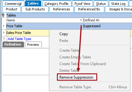 - Suppressed now displays in the Defined At column. The table can also no longer be defined or previewed; nothing will display on either the Definition or Preview tab when a suppressed table is selected.