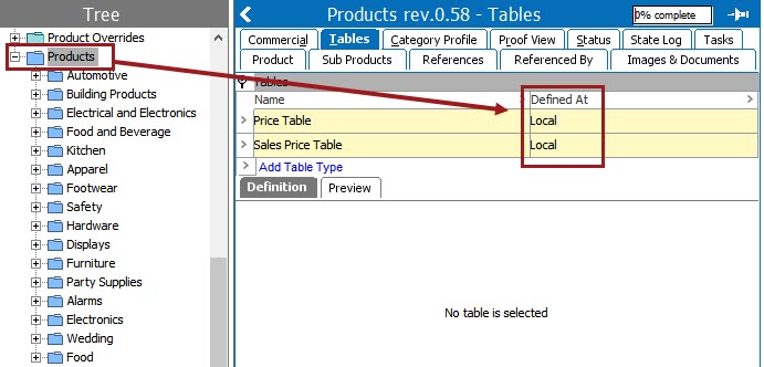 In this example, the Price Table and Sales Price Table have been created at the Products level. When you have selected the node on which the table is defined, Local displays in the Defined Atcolumn.