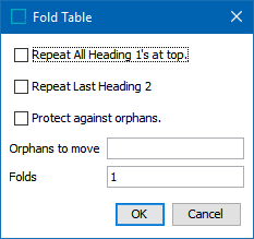 - Select Repeat All Heading 1's at top and/or Repeat Last Heading 2 depending on whether one or two table headings need to be repeated in the next fold.