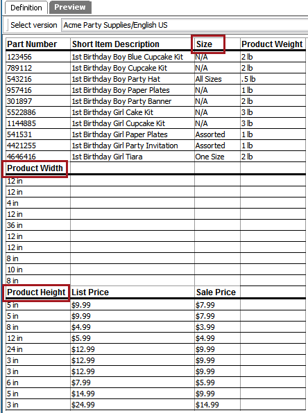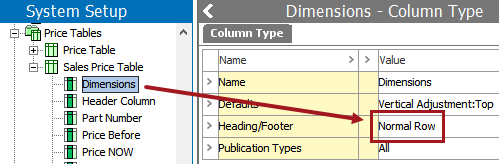 For this topic, the example table has eight columns, which includes the repeating column type of 'Dimensions.' The Dimensions column is a 'Normal Row' column. (Even though the setting is Normal 'Row,' this setting applies to both rows and columns and means that the column / row is not used as a header, a subheader, or a footnote column / row.)