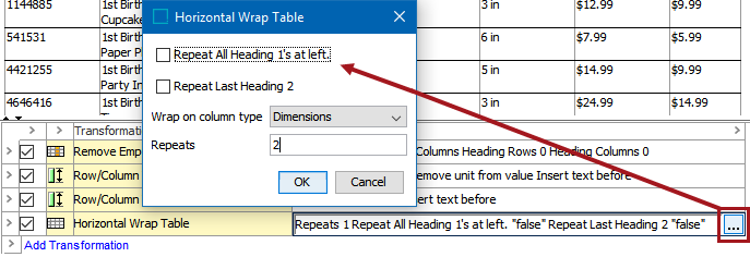 1. Next, the transformation itself must be configured. Click the ellipsis button () on the transformation to launch the Horizontal Wrap Table configuration dialog.