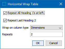 • Repeats: Enter the number of times the chosen 'wrap on' column type should appear in each wrap (fold) of the table. If (1) is entered, one 'Dimensions' column will appear on each table wrap: