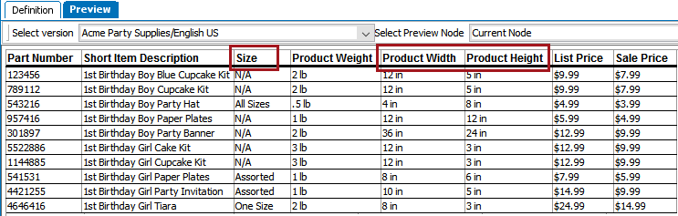 The 'Dimensions' column type is used in three places in the table. The attributes used for the 'Dimensions' column are Size, Product Width, and Product Height.