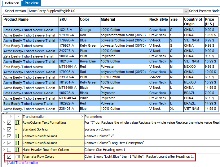 The Alternate Row Colors transformation alternates the background shading of rows at a specified frequency; for example, every other row, every two rows, etc.