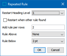 - From the Restart Heading Level list, choose either None, 1, or 2. The default setting is None, meaning that no line style is inserted at the heading level. When you select 1 or 2, the line style is applied again after each header row of the specified level number.