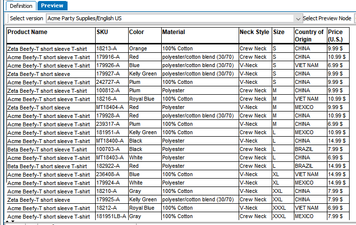In this example, a 3 pt rule line is added every time a value in the Size column changes, so a 3 pt rule surrounds all size S rows, all size M rows, etc. This is how the table looks before the transformation: