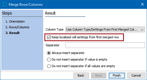 - If you choose 'Use Column Type/Settings from First Merged Column' (or, if merging rows, 'Use Row Type/Settings from First Merged Row'), the Keep localized cell settings from first merged column / Keep localized cell settings from first merged row checkbox will become activated. This setting enables cell-level formatting to be retained from the first merged column or row.