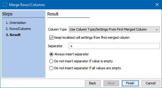 - Enter the Separator character(s) that should appear between values in the merged column or row. In this example, the separator is ' x ', an x with a space on both sides. Then, choose one of the three available options: