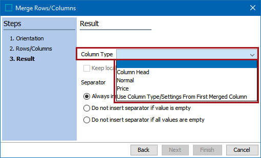 - In the Result step, specify the row or column type to use for the merged column or row. In addition to the legal column types / row types available for the table, you can also choose to keep the style of the first merged column / merged row.
