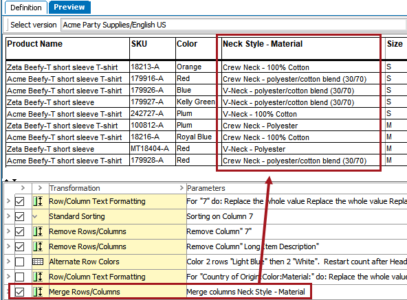In the following example, the 'Neck Style' and 'Material' columns are merged. Though it is common to merge columns or rows that are directly adjacent to one another, any columns or rows can be chosen. E.g., in the below example, 'Product Name' and 'Color' could be merged, and so forth.