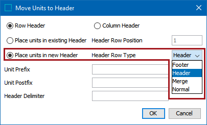 - Select Place units in new Header to create a new header row or column for the units, then, select a row or column type from the dropdown list. The row or column type can be any row or column type that is legal for the table and does not have to be specified as a Header or Subheader row on the row type or column type in System Setup.