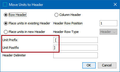- Enter a value in the Unit Prefix field to add content before the moved unit and enter a value in the Unit Postfix field to add content after the moved unit. A value can be placed in both the Unit Prefix and Unit Postfix fields to surround the unit with characters such as brackets. For example, add '[' as the prefix and ']' as the postfix to form [Hz]