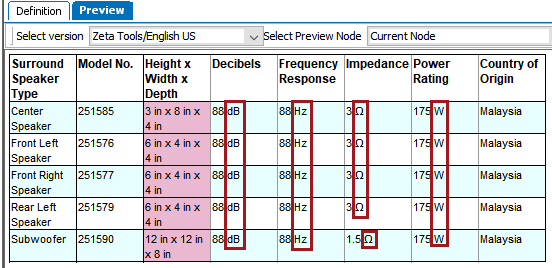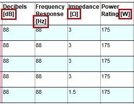 The following example uses a table that contains technical specifications about a set of surround speakers. The included units are Decibels (dB), Hertz (Hz), Ohms (Ω), and Watts (W). To keep the units from appearing multiple times in the table, they will be moved to the header row. This example uses an existing header and does not create a new one. However, configurations are present in the transformation that can allow for a new header to be created, e.g., if the units should appear in a subheader row.