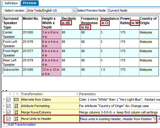 The Move Units to Header transformation enables a header row or header column to be built from unique units that appear on values inside the table. One use for this transformation would be for tables that contain highly technical product information; for example, for electronic components that use units such as Ohms (Ω). Additionally, it helps to save space on column widths or table heights.
