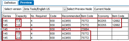 In the following example, the table has five rows. In the first two rows and the last two rows, all values are identical across every column except for the values in the 'Capacity' column.