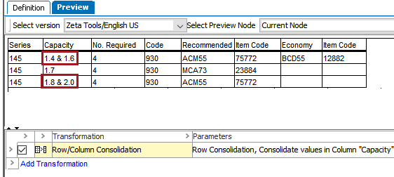 This is how the table appears after the transformation is applied. The first two rows are consolidated and the last two rows are consolidated. The different values for 'Capacity' are now merged into a single cell in the first row and a single cell in the last row. More information is provided in the following section on how to configure the transformation to obtain this result.