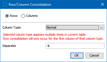 If the column type or row type that you choose appears more than once in the table, a warning will display in the dialog to ensure that you are aware that only the first column or row of this type will be affected by the transformation. To avoid confusion, it is advisable to use a dedicated column type or row type for consolidation operations.