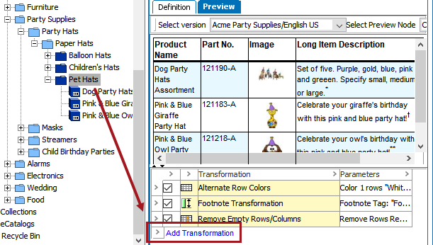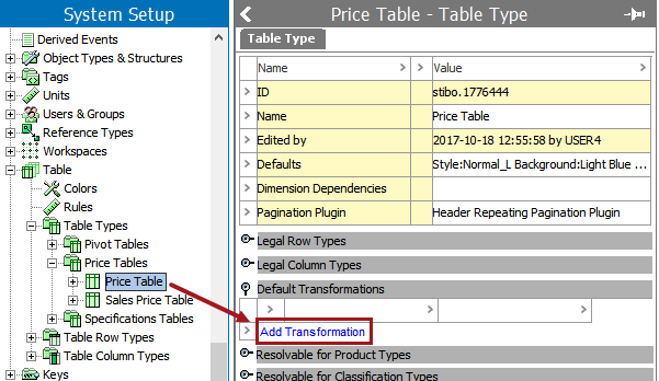 You can apply table transformations locally in the product or classification hierarchy of the Tree, and/or globally in System Setup. Any transformation added globally can be overridden later at the local level