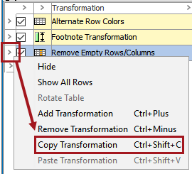 To save effort, transformations can be copied and pasted. To copy and paste to a different table means that the transformation does not have to be created again from scratch. To copy and paste within the same table could also be useful since transformations are applied accumulatively and sequentially. For example, a Remove Empty Rows/Columns transformation might be applied to remove empty rows or columns, then another transformation applied later removes additional values that create new empty rows or columns. So, the Remove Empty Rows/Columns transformation would need to be applied again, below the transformation that created new empty rows / columns.