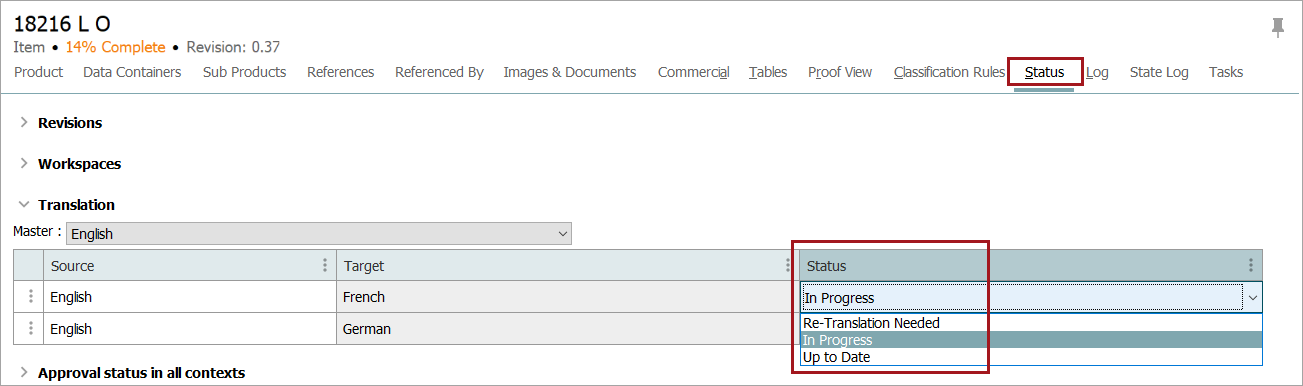 • In the Tree tab, select the object whose status needs to change. Click the Status tab, and then expand the Translation section by clicking the flipper. Find the translation relation (source language to target language) where the status needs to be changed, and then click into the cell in the Status column. A dropdown displays with the available statuses. Select the appropriate status and the change is complete.