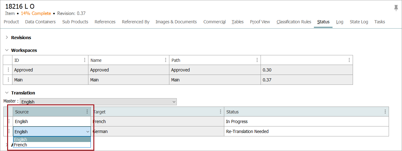 1. In the Tree tab, select the object whose source language needs to change. Click the Status tab, and then expand the Translation section by clicking the flipper. Find the translation relation (source language to target language) whose source language needs to be changed, and then click into the cell in the Source column. Selecting a new language completes the task. If the source language has been incorrectly set for one translation, it likely needs to be changed for all. If this is the case, repeat this step for all applicable translation relations.