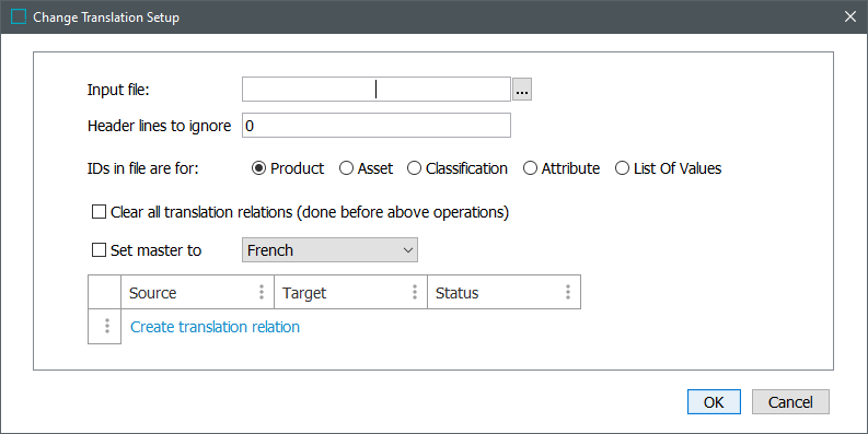 • If Clear all translation relations is checked, all existing translation relations are removed from the matched products, and the relations specified in this dialog are applied to the matched products.