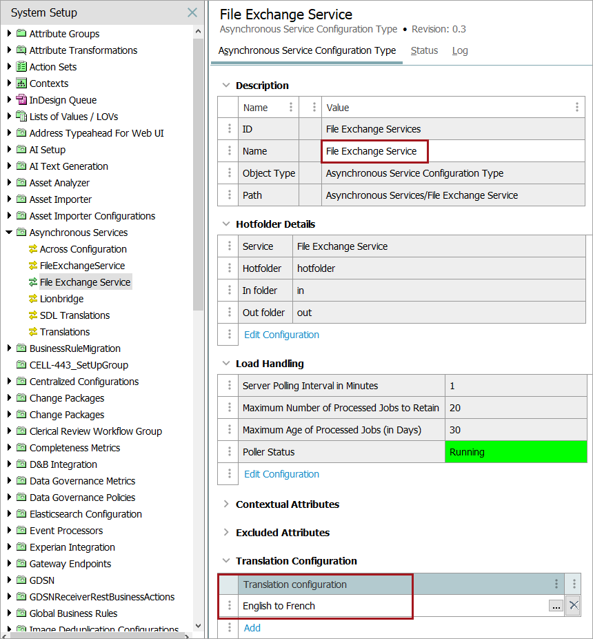 An asynchronous service must be created. Note the name of the asynchronous translation service in this example, 'File Exchange Service, ' and the translation configuration, 'English to French.'