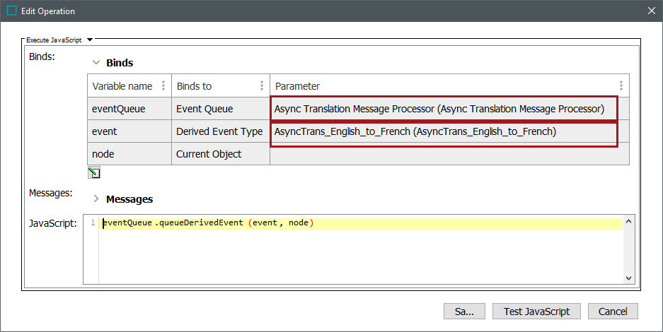 Note that in the example above, the event processor 'Async Translation Message Processor' has been selected in the first row's Parameter cell, and the derived event 'AsyncTrans_English_to_French' has been selected in the second row's Parameter cell.