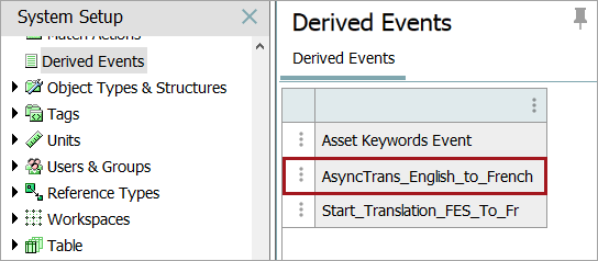 In the example below, a derived event named 'AsyncTrans_English_to_French' has been created. This derived event will be selected later in this topic when configuring the business action and the event processor.