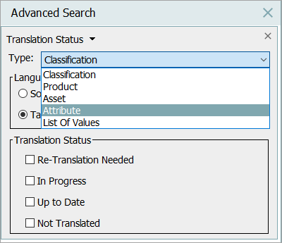 In the Type dropdown, choose the object type you want to search for. The user may choose between these object types: Classification, Product, Asset, Attribute, and List Of Values.