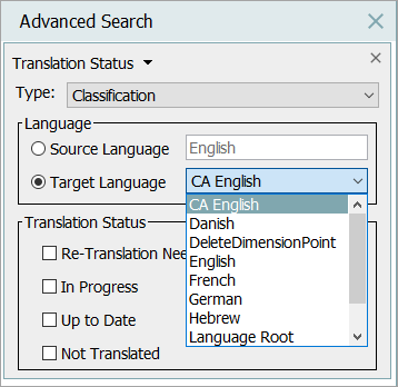 In the Language area, select Source language or Target language, and then choose the relevant language. You may notice that, as default, the source language is set to your current context and grayed out. It may be changed, but the moment you select Source Language, the Target Language switches to the language your context is currently set to.