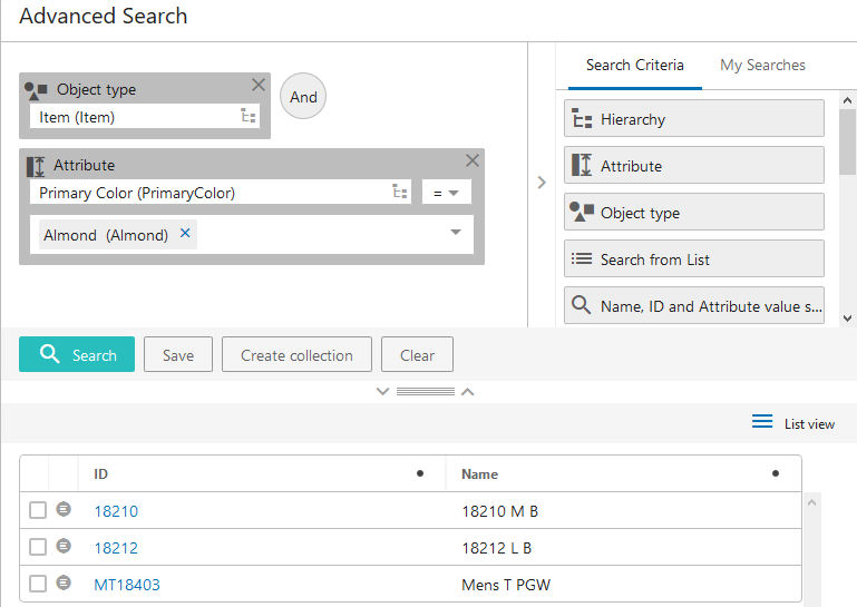 Object type (Item) AND Attribute (Primary Color)=Almond