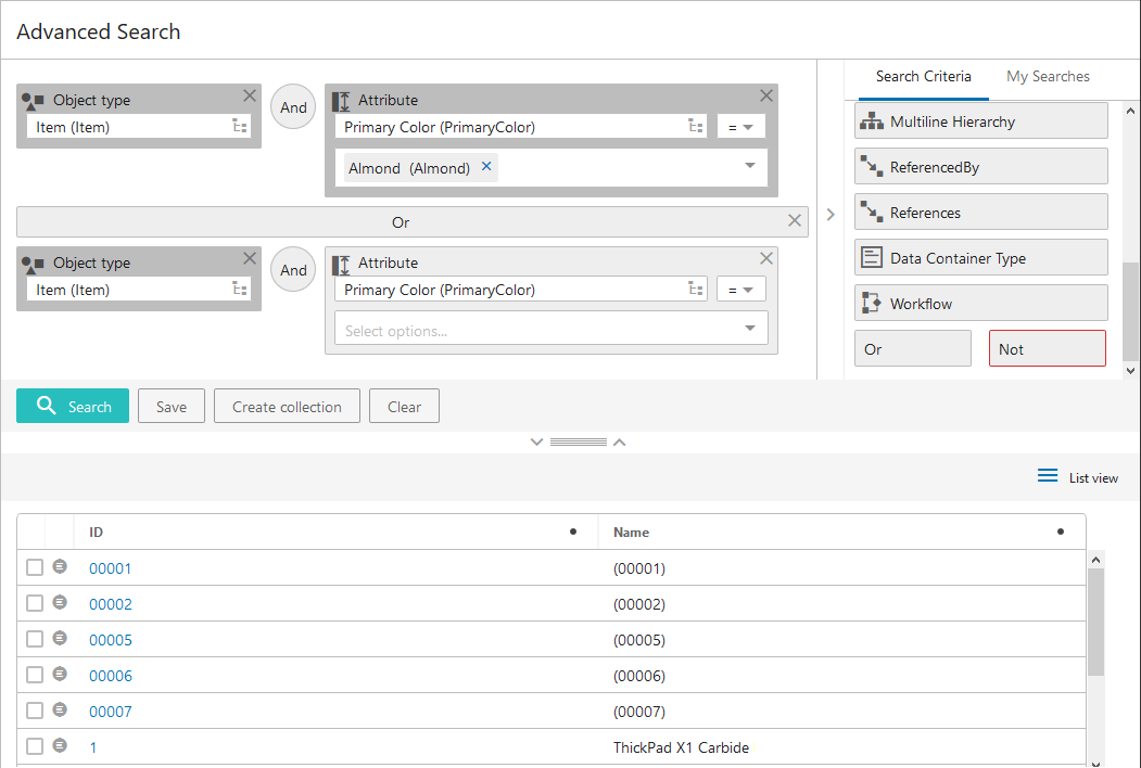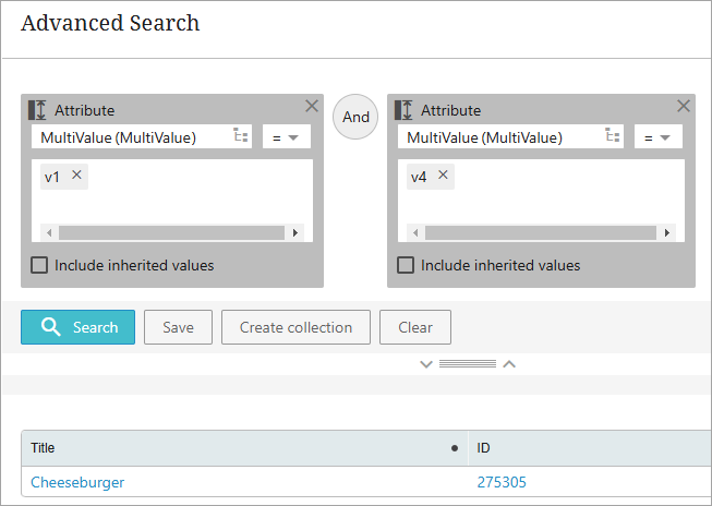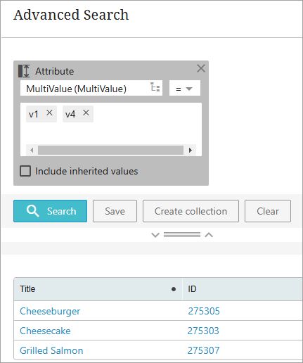 Searching for Multiple Values on Multivalued Attributes: By default, the Attribute criterion assumes an OR operator for the multiple values the user inputs. This means that the search result will include a product or entity having any one of the input values. This also applies to attributes searched within data containers. Refer to Example 5 below.