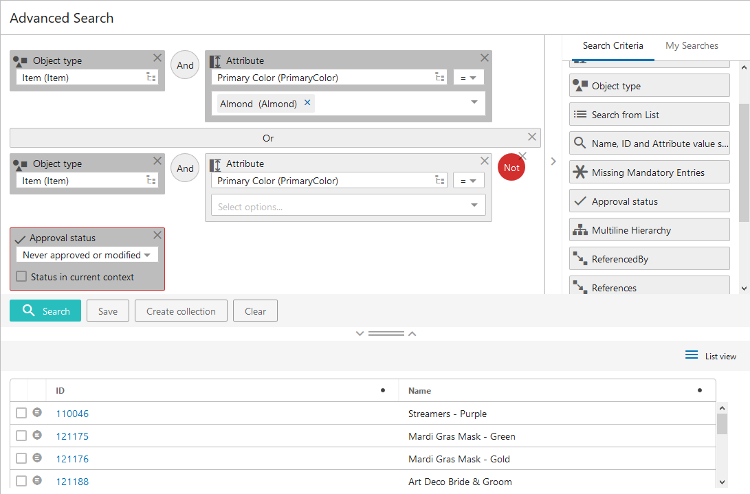In Example 3, if the user also wants to exclude unapproved object types from the Item / Primary Color=Almond portion of the query, they would go back and add the NOT operator and the 'Approval status (Never approved)' criteria in front of the OR operator.