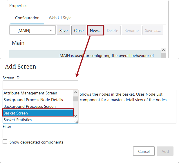 Select the Basket Selection Condition. In the Screen parameter dropdown, choose the Basket Screen you created in the previous steps. Click, Add. Save and close the designer.