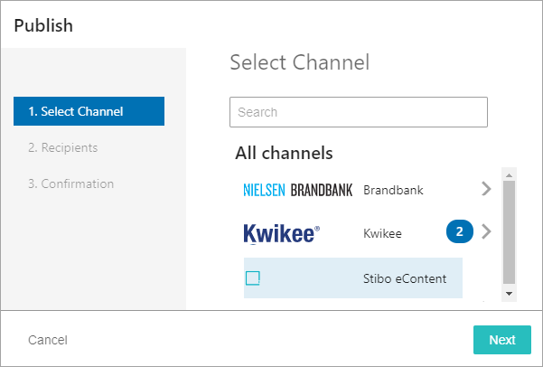 Search for and select one or more channels from the list and click the Next button.