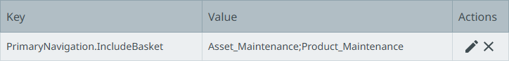 If the Web UIs displaying the basket should be restricted, review the PrimaryNavigation.IncludeBasket property. In the Self-Service UI, select the environment and click the 'Configuration properties' tab. Include a list of the Web UI IDs that should display the basket, each separated by a semicolon. For example, to indicate that two Web UIs with the IDs 'Asset_Maintenance' and 'Product_Maintenance' should display the basket functionality, add the following: