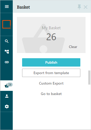 The 'Publish' option starts a wizard that enables you to send the basket contents to a selected PDX (Product Data Exchange) channel. For more on PDX, refer to the Product Data Exchange topic in the Data Integration documentation.