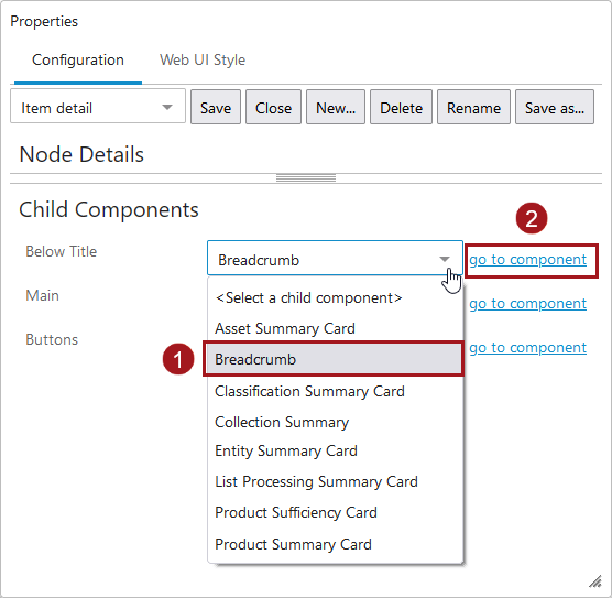 - Access the designer on the Node Details screen mapped to the relevant Asset object type. Under 'Child Components', select the 'Breadcrumb' option from the 'Below Title' dropdown. Then click 'go to component'.