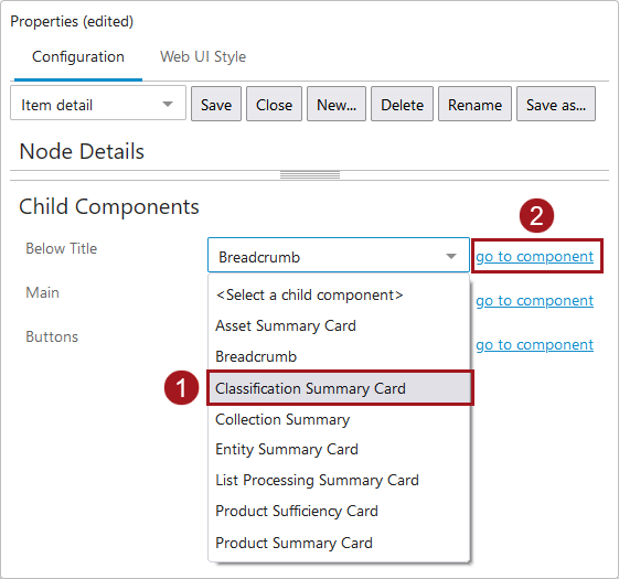 1. Access the designer on the Node Details screen mapped to the relevant Classification object type. Under 'Child Components', select the 'Classification Summary Card' from the 'Below Title' dropdown. Then click 'go to component'.