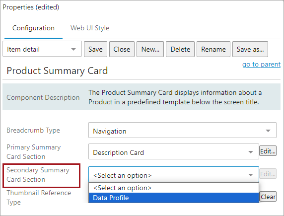 1. In the 'Classification Summary Card Properties' screen in the designer, select one of two options from the 'Primary Summary Card Section': 'Description Card' or 'Attribute Card'.