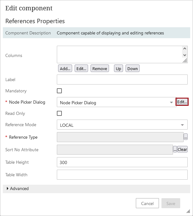 1. In the Reference Properties screen, on the Node Picker Dialog field, select the Edit button.