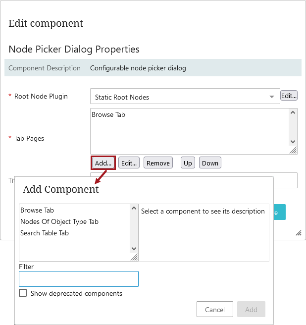 1. Back on the Node Picker Dialog Properties go to the Tab Pages field and click Add.
