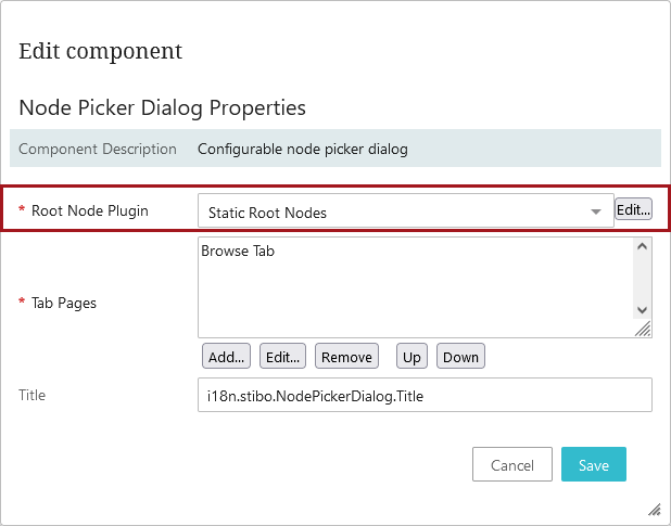 1. On Node Picker Dialog Properties under the Root Node Plugin field, select Static Root Node from the dropdown.