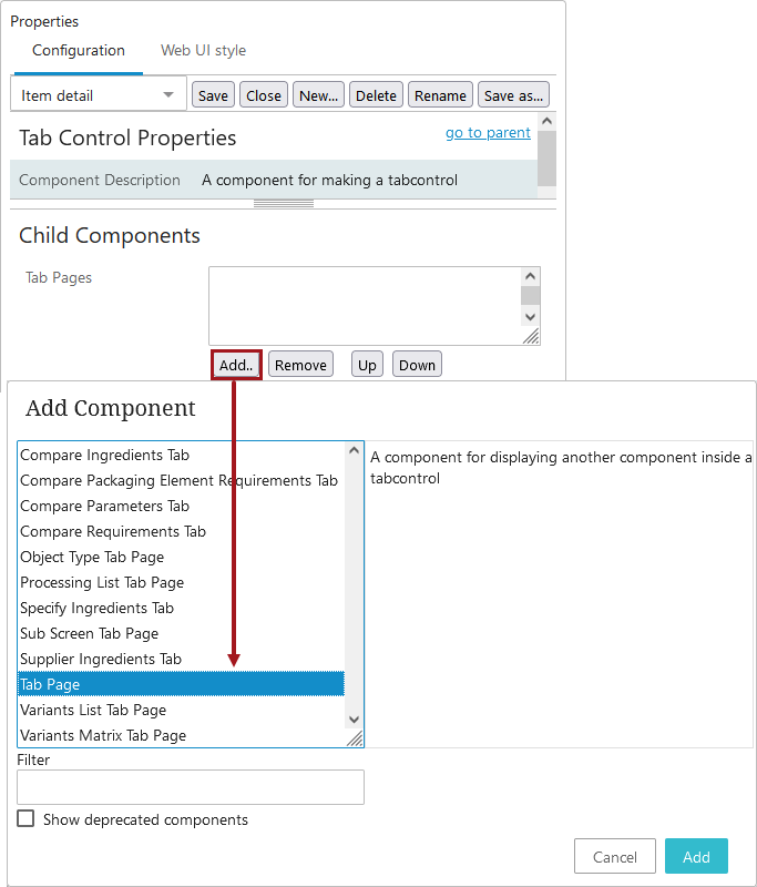 1. On Tab Control Properties, go to Child Components > Tab Pages field > add a new Tab Page by clicking on Add button.