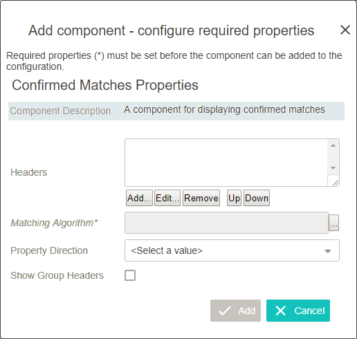 • Headers: In this parameter, specify which headers will appear on the table by clicking Add... and selecting the desired header. Depending on the header selected, additional configuration steps may be required. Ideally, attributes most relevant to matching should be specified.