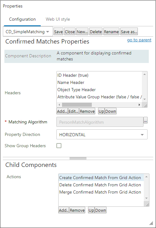 • Actions: In this parameter, click the Add... button to add actions to this component. The available actions are the 'Create Confirmed Match From Grid Action,' which adds a button to add new confirmed matches from the screen, the 'Delete Confirmed Match From Grid Action,' which adds a remove node button to the screen, and the 'Merge Confirmed Match from Grid Action' button, which allows confirmed matches to be merged. The 'Create Confirmed Match from Grid Action' requires configuration.