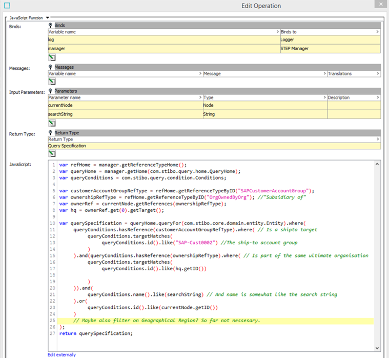 This JavaScript use case is of a ship-to reference search, only allowing the user to select ship-to targets that are actual ship-to accounts and part of the same organization hierarchy as the currently selected node.