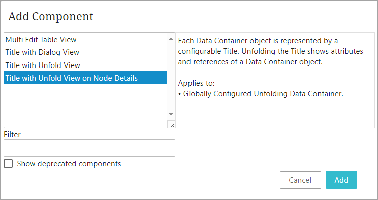 The Globally Configured Unfolding Data Container component must be created on a Node Editor child component within a Node Details screen. These steps are outlined in the Globally Configured Unfolding Data Container Component topic in the Data Containers in Web UI section of the Web User Interfaces documentation.